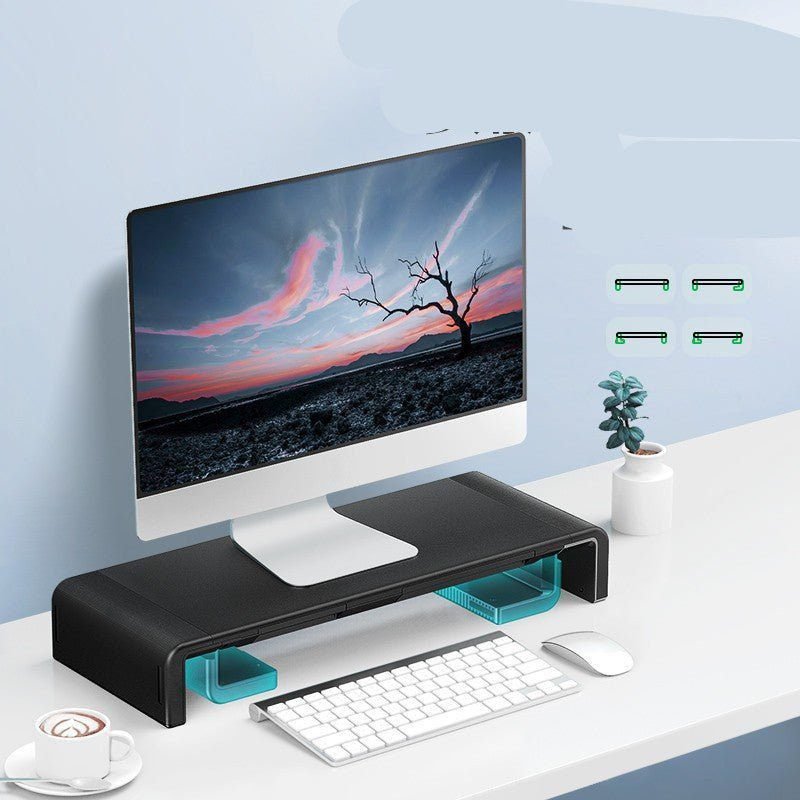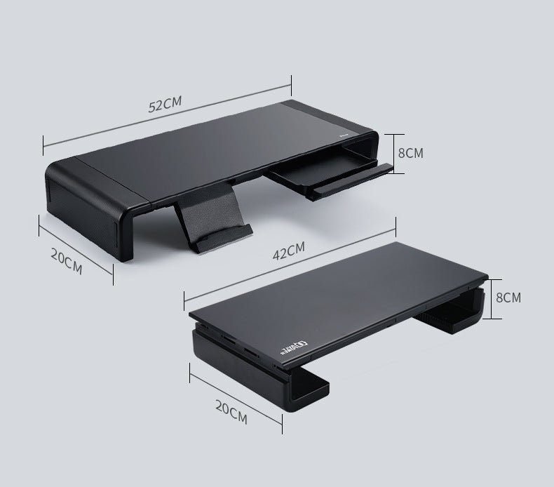 Material: ABS+H steel plate + non-slip siliconeProduct size: 520* inner length 420*80mmType: monitor stand/computer screen increase standApplicable models: desktop computer monitor/notebook computerLine length: wirelessProduct weight: 1.3kgColour: Black